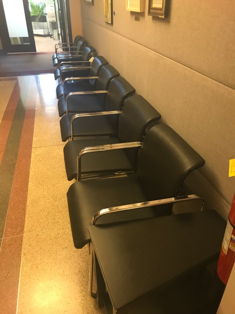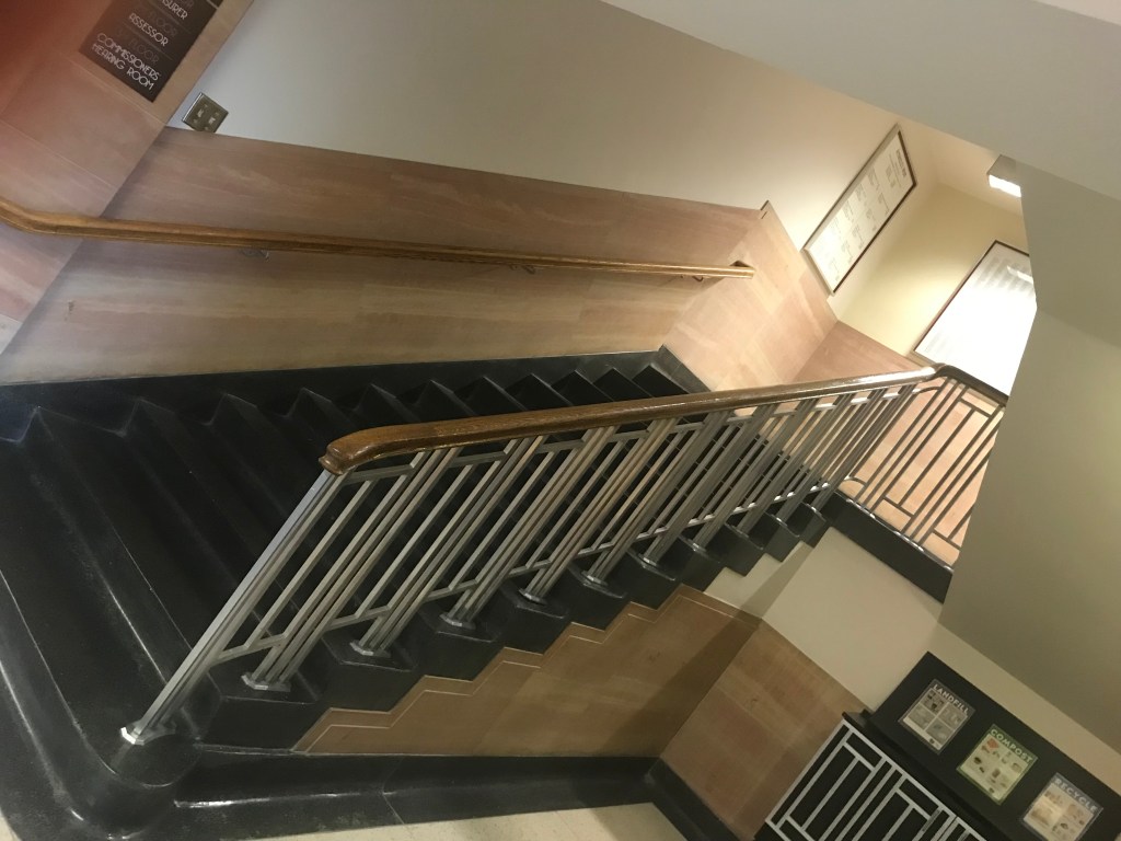 This is one of the first things you see when you go in. it is a really nice overlook with the original lighting fixtures above it.The front hallway. It’s pretty sleek.Upstairs hallway by office.Tucked away in a corner hallway. they use this door each day to lock access.