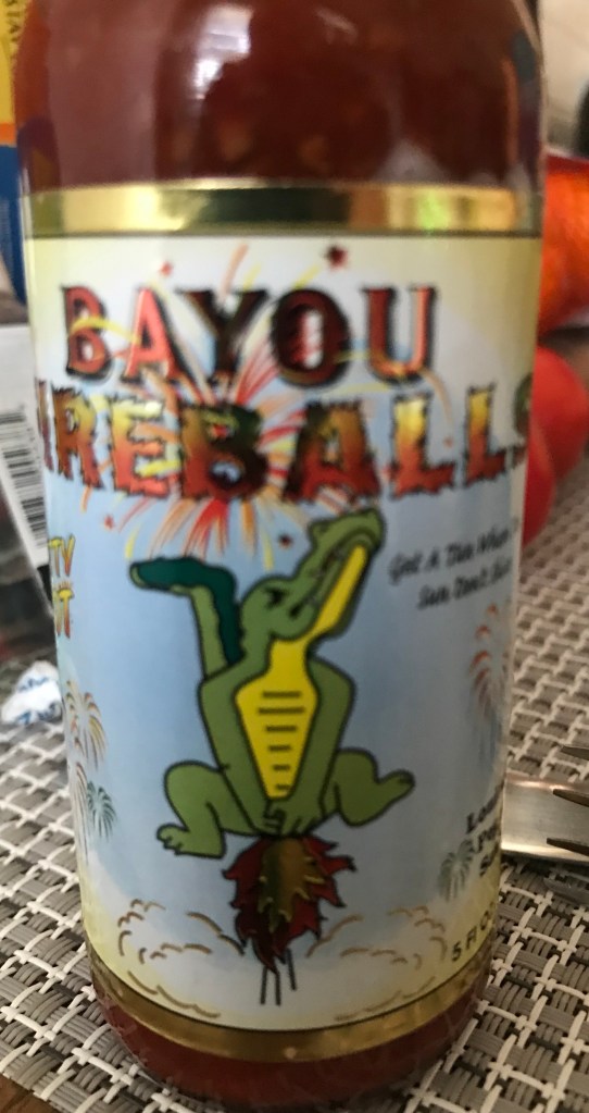 I have been cooking more which is terrific fun. Digging around in the pantry I came upon a bottle of Bayou Fireball I got as a gift.